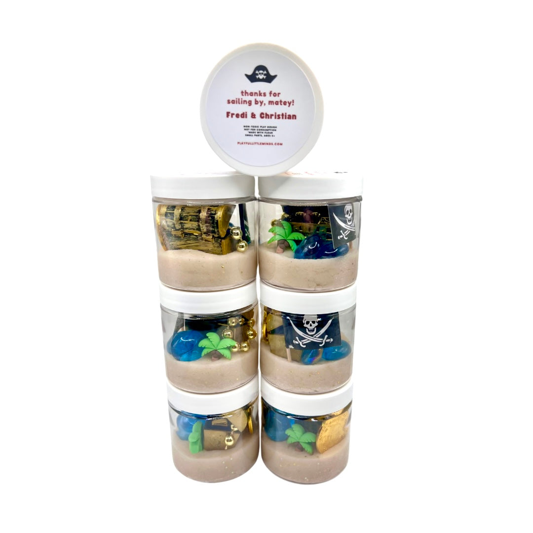 Each 4 oz jar includes 2 oz of nontoxic play dough and a variety of pirate treasure-themed objects.